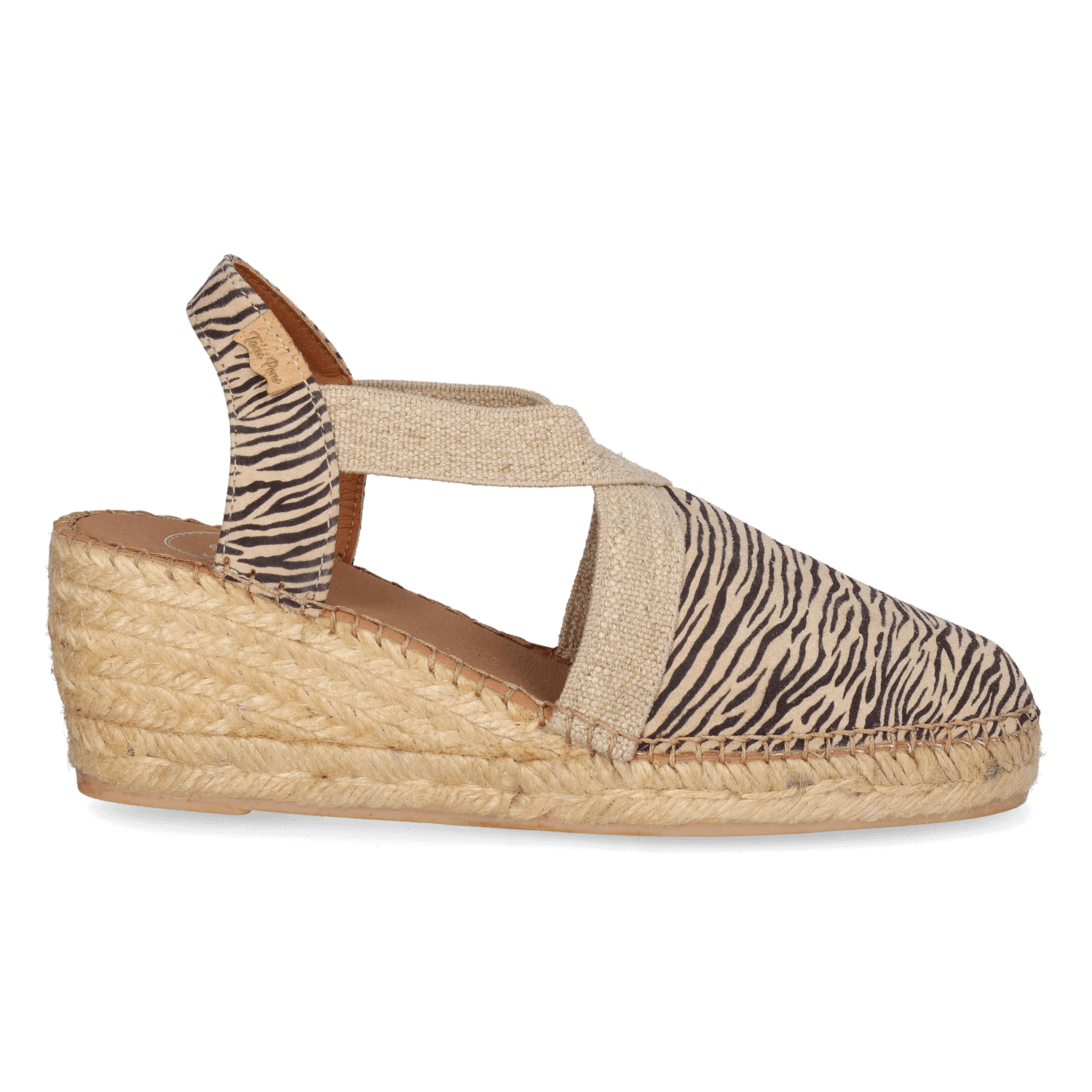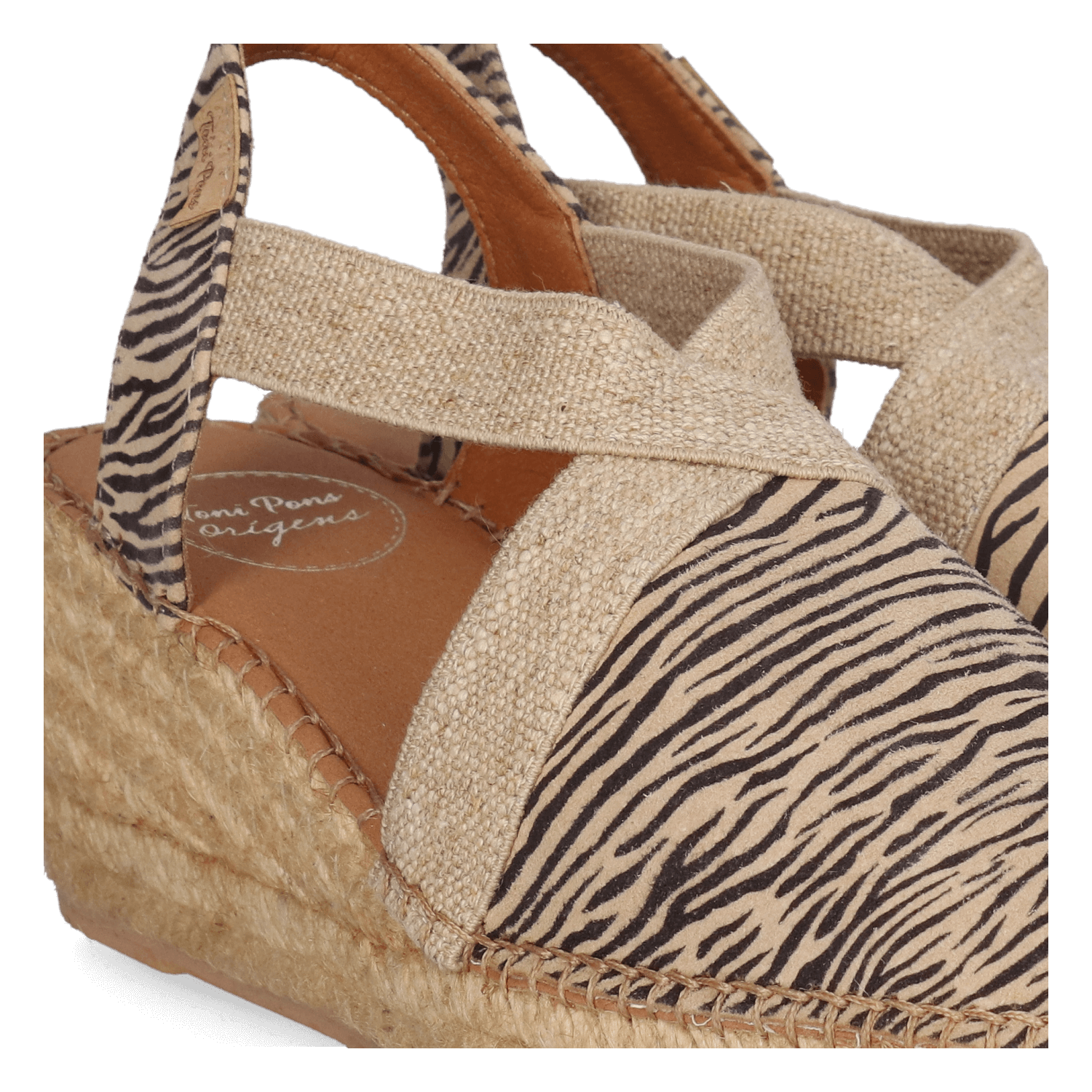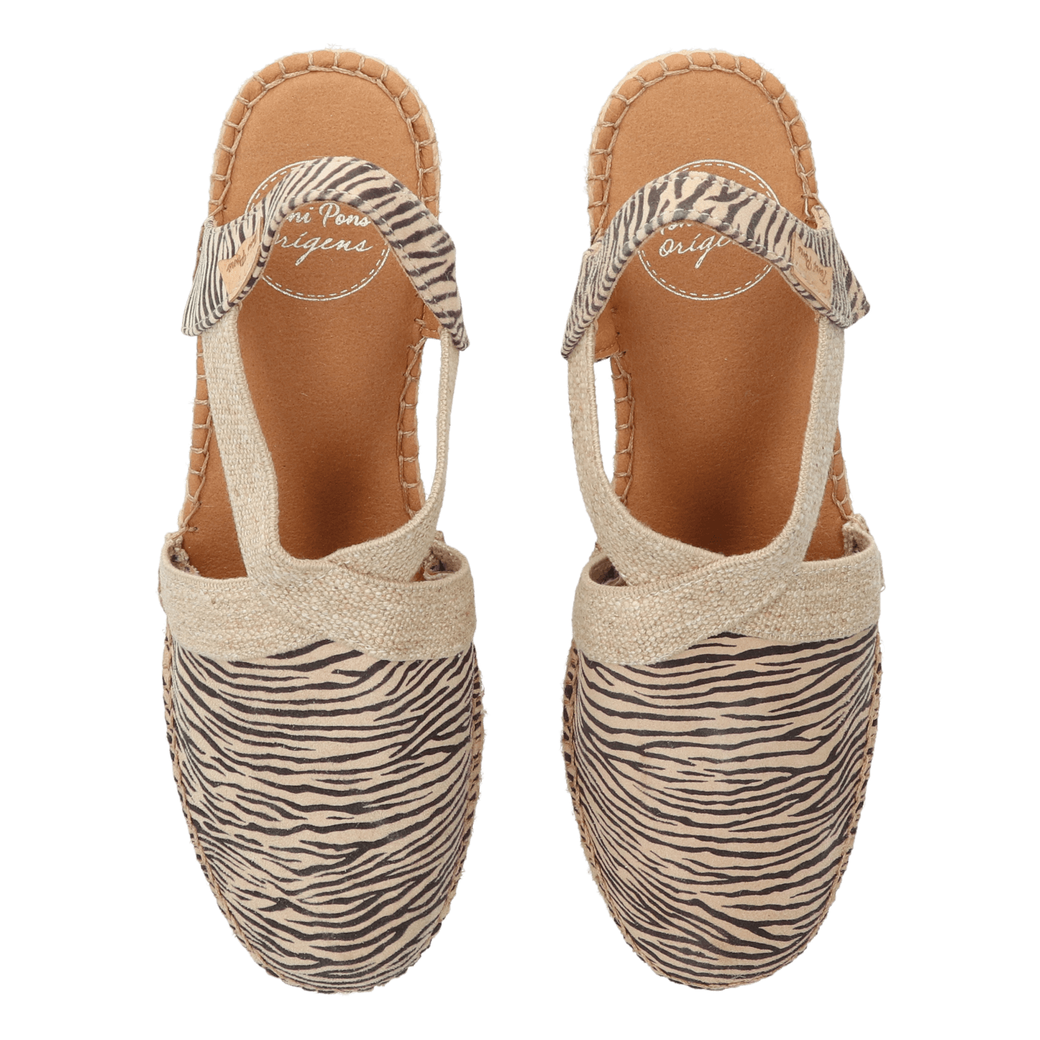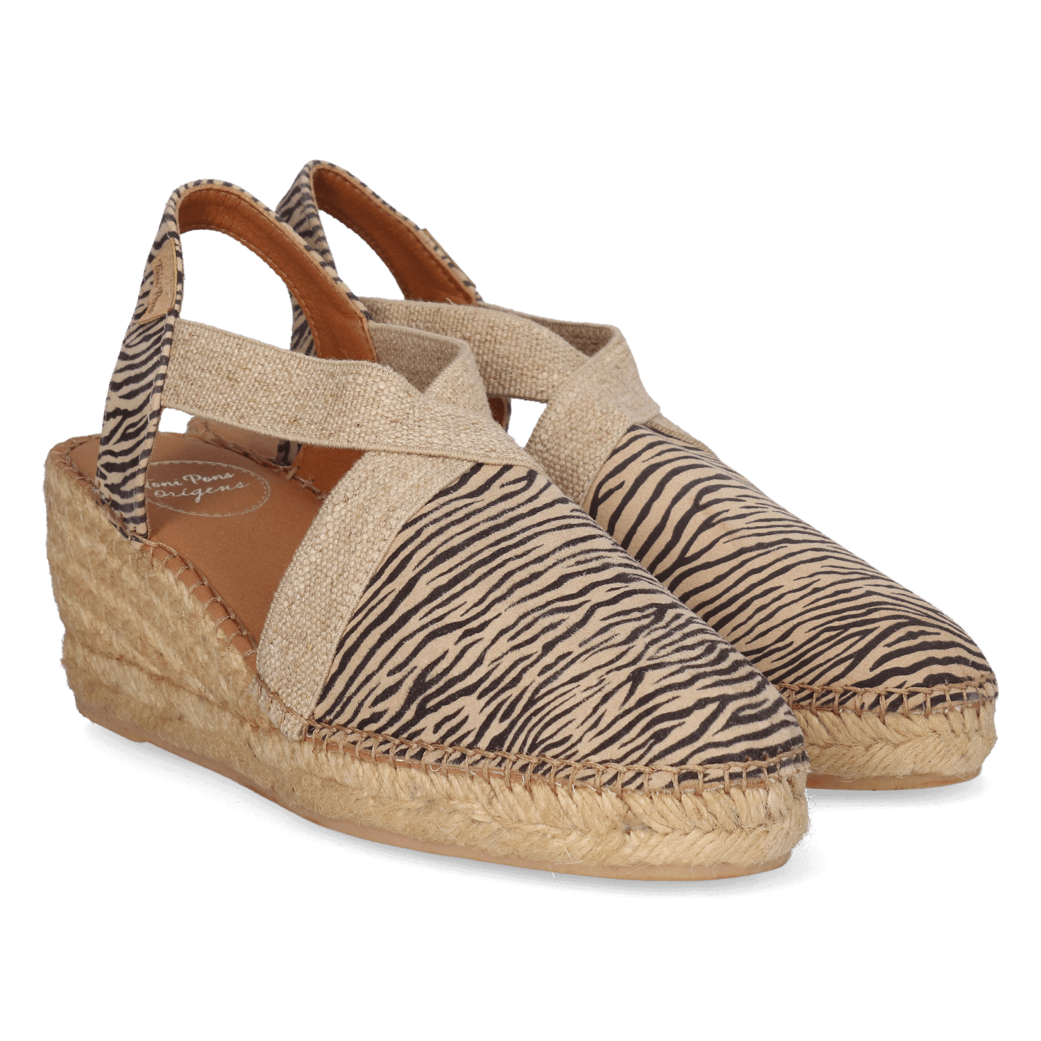 Deze Terra-ZB is een dames espadrille uit de Orígens-collectie van Toni Pons. De espadrille met sleehak heeft een bovenwerk met zebraprint en een stevige elastische katoenen band voor instapgemak en een betrouwbare houvast. De espadrille heeft een klassiek design dat zich moeiteloos laat combineren met veel zomeroutfits. De binnenzool is zacht gevoerd voor extra comfort, terwijl de rubberen antislipzool zorgt voor goede grip. De jute espadrillezool is uitgevoerd met een sleehak van 4 centimeter hoog en een plateau van 2 centimeter wat de totale hakhoogte op 6 centimeter brengt.